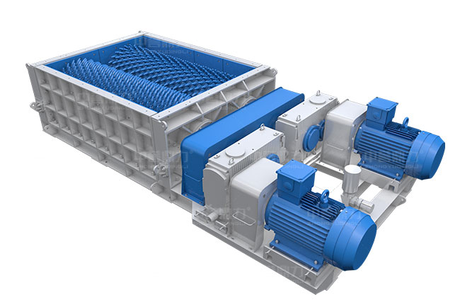 雙齒輥破碎機在工作時,物料進入破碎腔,通過高速旋轉(zhuǎn)兩齒輥對物料進行剪切、擠壓、拉伸等作用對物料進行破碎,齒輥中心距三擋可調(diào),保障出料粒度。