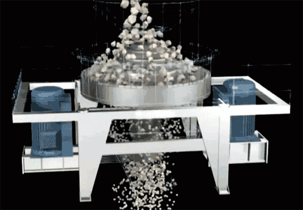 沖擊式破碎機(jī)通常用在物料的破碎,被普遍運(yùn)用于種類多巖石等堅(jiān)硬物料的破碎,物料由下料斗進(jìn)入沖擊式破碎機(jī),經(jīng)分料器將物料分成兩部分,有的由分料器中間進(jìn)入高速旋轉(zhuǎn)的葉輪中,在葉輪內(nèi)被以高的速度加速,其加速度可達(dá)數(shù)百倍重力加速度,然后以60-70米/秒的速度從葉輪三個(gè)均布的流道內(nèi)拋射出去,先同由分料器四周自收落下的有的物料沖擊式破碎機(jī)碎,然后一起沖擊到渦支腔內(nèi)物料襯層上,被物料襯層反彈,斜向上沖擊到渦動(dòng)腔的頂部,又變化其運(yùn)動(dòng)趨勢,偏轉(zhuǎn)向下運(yùn)動(dòng),從葉輪流道發(fā)射出來的物料形成持續(xù)的物料幕,這樣一塊物料在渦動(dòng)粉碎腔內(nèi)塑造兩次以至無數(shù)次機(jī)率沖撞、磨擦和研磨破碎作用,被破碎的物料由底部排礦口排出