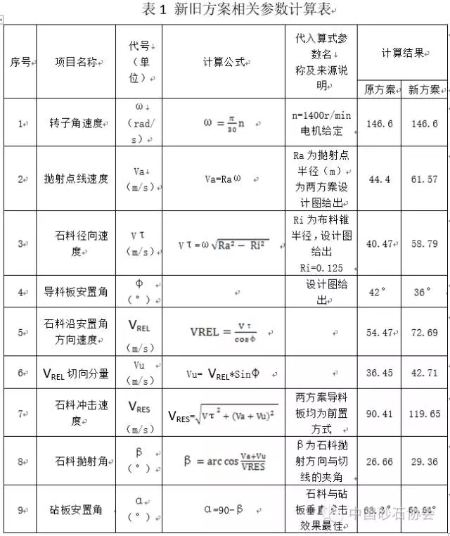 新舊方案的參數(shù)變化,導(dǎo)致了石料沖擊速度VRES和拋射角β的不同。為獲得佳的碰撞破碎效果,布置在機(jī)身腔壁的砧板的安置角α相應(yīng)作調(diào)整。兩個(gè)方案相關(guān)參數(shù)的計(jì)算過程見表1。