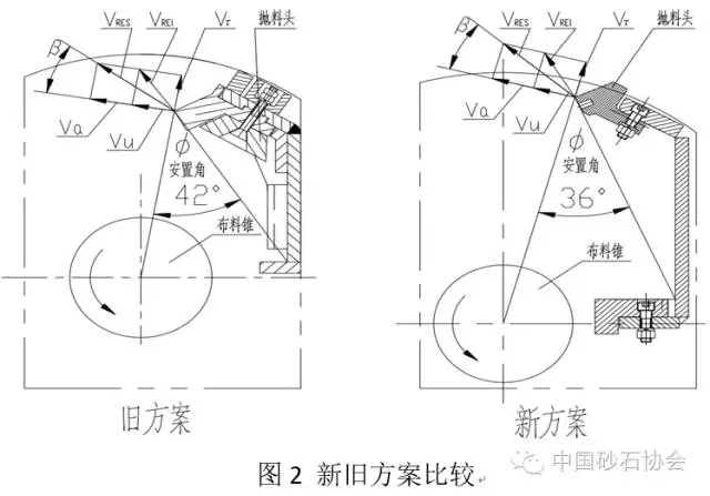 在轉(zhuǎn)速、葉輪直徑、布料錐大小不變的前提下,著眼于盡可能增大拋射點(diǎn)的半徑Ra,適當(dāng)調(diào)整導(dǎo)料安置角φ,提出了改進(jìn)方案。新舊方案拋料頭的布置見圖2。