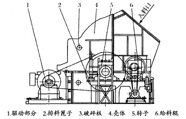 在單段錘式破碎機運行過程中,大塊石頭物料進入破碎腔內,堆放在機器內特設的中間托架上,由在托架間隙中運行的破碎機錘頭擊碎而墜落,再經高速運轉的錘頭進一步打擊而細碎,符合尺寸規(guī)格的石料, 后經篦板均整合格后排出。