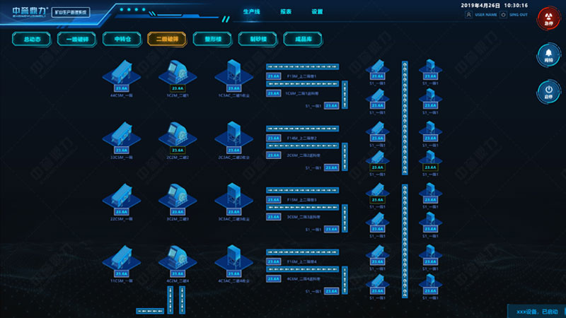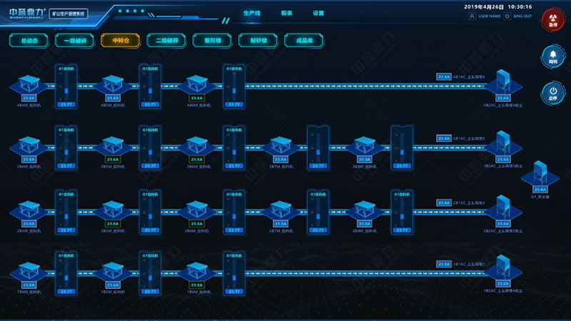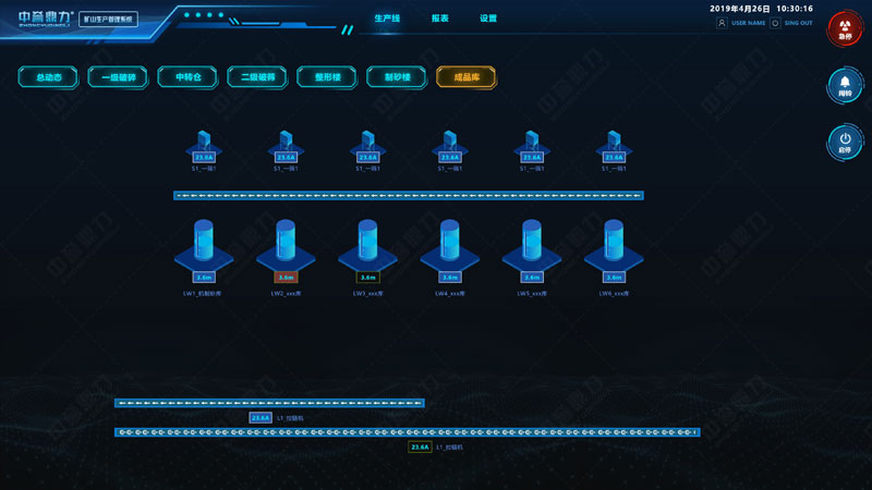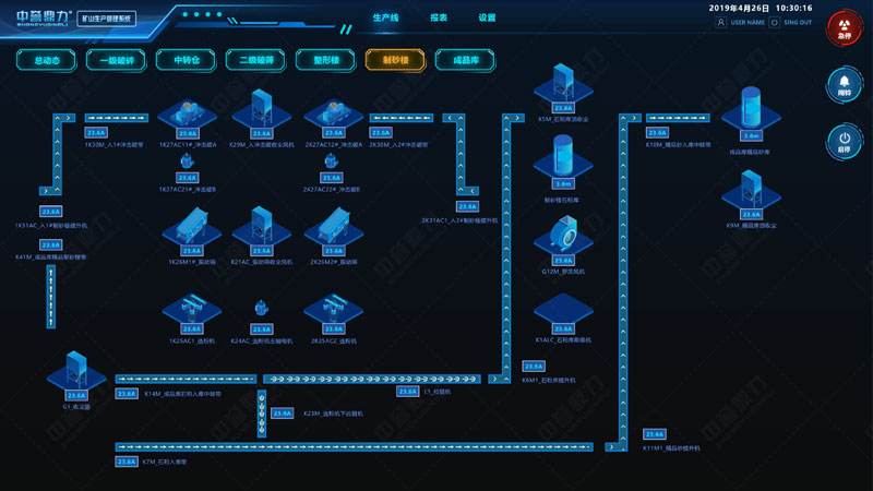 礦山生產(chǎn)管理系統(tǒng)三維形式展現(xiàn)整個(gè)生產(chǎn)線,可遠(yuǎn)程控制砂石骨料線的給料機(jī)、破碎機(jī)、皮帶機(jī)、制砂機(jī)、振動(dòng)篩等各設(shè)備的啟停,通過傳感裝置感知設(shè)備運(yùn)行狀態(tài)(如設(shè)備溫度、電壓、電流、振頻等數(shù)據(jù)),可監(jiān)測(cè)生產(chǎn)線產(chǎn)量、各儲(chǔ)料倉料位高度等信息,自動(dòng)生成報(bào)表,實(shí)現(xiàn)礦山生產(chǎn)環(huán)節(jié)的智能化操控管理及生產(chǎn)決策。