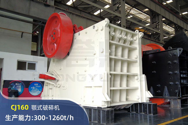 CJ160顎式破碎機(jī)進(jìn)料口尺寸1600×1200mm,進(jìn)料粒度960mm,出料大小150-300mm,電機(jī)功率250kw,時(shí)產(chǎn)可達(dá)1260噸。