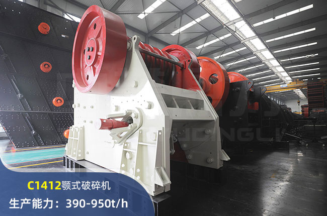 C1412顎式破碎機(jī)進(jìn)料口尺寸1400×1200mm,進(jìn)料粒度≤1200mm,出料大小≤95mm,電機(jī)功率185kw,時產(chǎn)在390-950噸左右。