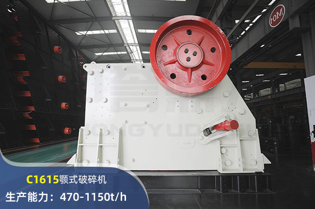 C1615顎式破碎機進料口尺寸1610×1400mm,進料粒度≤1400mm,出料大小≤120mm,電機功率250kw,時產(chǎn)量在1150噸左右。