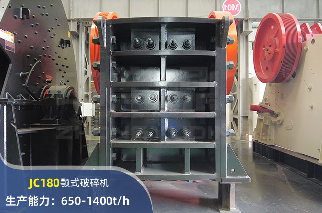 JC180顎式破碎機進(jìn)料口尺寸1800×1500mm,進(jìn)料粒度≤1280mm,出料大小≤175mm,電機功率355kw,時產(chǎn)量在1400噸。