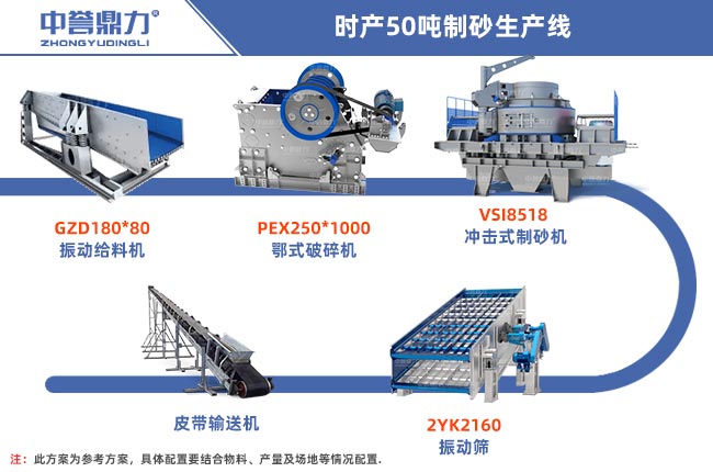 時產(chǎn)50噸制砂生產(chǎn)線產(chǎn)量比較小,可以先用鄂破把物料進行一次破碎,再用沖擊式制砂機進行制砂,然后振動篩篩分,洗砂機進行清洗,成品砂就生產(chǎn)完成了。