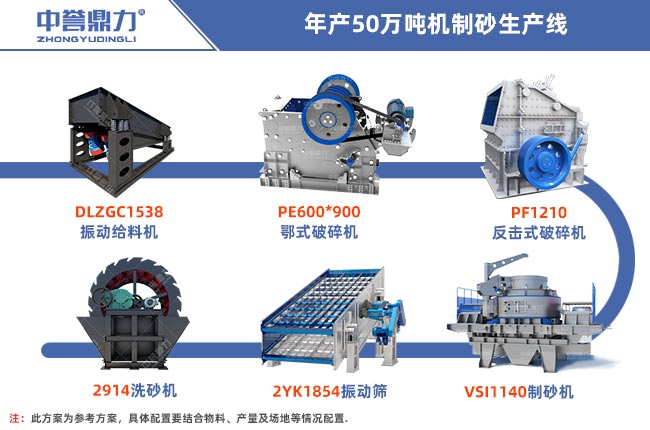 年產(chǎn)50萬噸,采用PE600×900顎式破碎機+4臺PEX250×1000細(xì)碎鄂破+VSI7611沖擊式制砂機+配套設(shè)備方案,適用于鵝卵石等硬巖破碎,因投資預(yù)算不高,故中細(xì)碎設(shè)備采用細(xì)碎鄂破機,如預(yù)算充足,可以直接采用一臺圓錐破碎機。