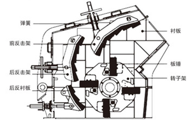 1214反擊破碎機(jī)內(nèi)部結(jié)構(gòu)主要由板錘、轉(zhuǎn)子架、轉(zhuǎn)子、反擊襯板、彈簧等組成。