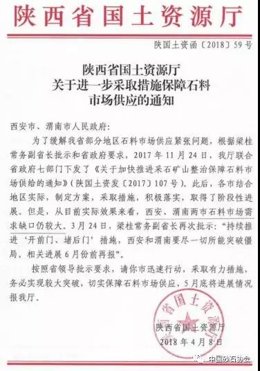 近日,陜西省土資源廳發(fā)布《陜西省土資源廳進(jìn)一步采取措施保障石料市場供應(yīng)的通知》,提到:目前,西安、渭南兩市石料市場需求缺口較大!锻ㄖ芬螅何靼埠臀寄弦M所能僵局,迅速行動,采取有力措施,務(wù)實現(xiàn)較大,切實保障石料市場供應(yīng),5月底將進(jìn)展情況報陜西省土資源廳。