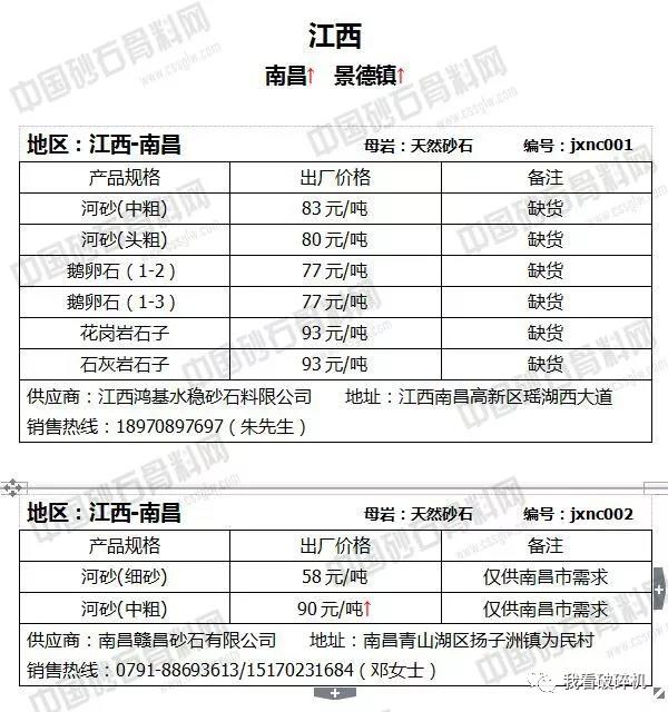 江西地區(qū):南昌中粗河砂價格上調30元/噸,景德鎮(zhèn)砂石價格上調幅度在2-6元/噸。