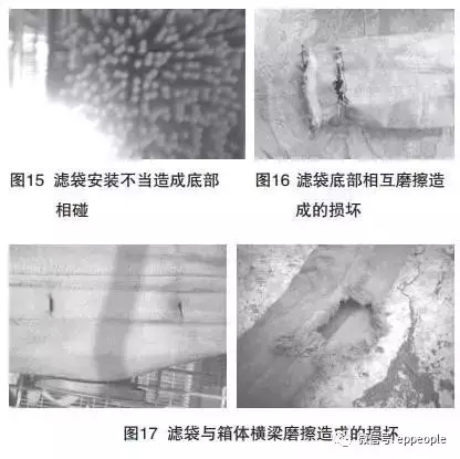 濾袋安裝不良,會(huì)由于花板、骨架等原因不與花板 相垂直(如圖15);如果過(guò)于偏斜就會(huì)造成濾袋底部相 互磨擦而損壞(如圖16);濾袋與壁板及濾袋與箱體橫 梁間也會(huì)由于磨擦而造成濾袋損壞(如圖17)。