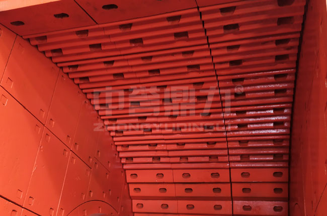 主襯板的背面是采用的凸起定位塊來固定主襯板位置,螺栓主要起拉緊襯板作用,螺帽在主襯板背面,避免螺栓受剪切力,取消了傳統(tǒng)的擋軸盤結(jié)構(gòu),用邊盤護套當錘軸,結(jié)構(gòu)簡單,工作性能穩(wěn)定。