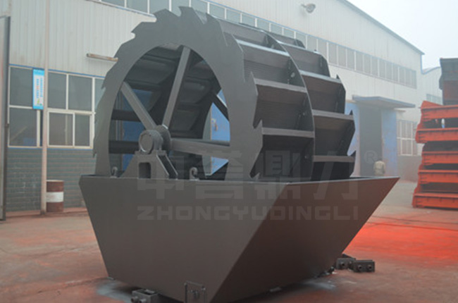 工作時,在電機的帶動下三角帶、減速機、齒輪減速后帶動葉輪進行轉(zhuǎn)動,石粉物料由給料槽進入洗槽中,在葉輪帶動下翻滾,等除去石粉表面雜質(zhì)后完成清洗,從溢出口洗槽排出。干凈的石粉由葉片帶走,然后砂石從旋轉(zhuǎn)的葉輪倒入出料槽。