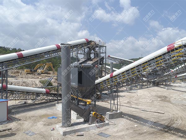 石頭由振動送料機均勻地送入顎破進行粗碎,粗碎后的石頭由皮帶運輸機送入到破沙機進行深度破碎,整型破碎后的石頭被運輸?shù)胶Y機進行篩選分級,符合成品粒度要求的石頭被送入砂石洗選機械清洗,清洗后由成品皮帶運輸機輸出即為成品;未符合成品粒度要求的石頭從篩機返回破沙機再次破碎,形成閉路多次循環(huán),成品粒度可按用戶的需要進行組合和分級,如果選擇干法加工技術,可搭配粗細粉分離機和除塵機械,