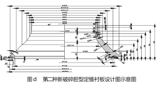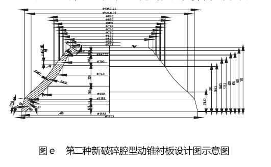 我們生產(chǎn)線設(shè)計(jì)小組用了半個月的時間設(shè)了三種新粉碎腔型(如圖b 所示,詳細(xì)數(shù)值見表c)。三種粉碎腔型相應(yīng)的不變襯板及動錐襯板的圖紙?jiān)O(shè)計(jì)完畢后,立即投入了生產(chǎn)解決,并在三套新備件回來后,我們在連續(xù)三個襯板的采用周內(nèi),分別在平均莫氏硬度f=12 的鐵巖石整型破碎生產(chǎn)中試用了這三種腔型,在生產(chǎn)平均莫氏硬度f=12 的鐵巖石整型破碎生產(chǎn)時,由于粉碎腔型中平行粉碎帶斜長的增加,整型破碎效果越來越好,但過分增加,勢會引起整型破碎加工能力的指標(biāo)要求。結(jié)合三種新式腔的采用效果,我們終采用了種型腔,與它相連的不變襯板及動錐襯板的效果圖分別如圖d、圖e 所示。